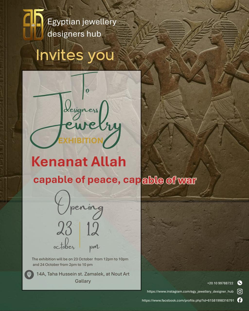 تعقد “منصة مصممي الحلي والمجوهرات المصريين” أولى فعالياتها يومي ٢٣-٢٤ شهر أكتوبر الجاري بمناسبة افتتاح المتحف المصري الكبير، والتي تتمثل في معرض للتصميمات بعنوان “كنانة الله.. قادرون على السلام، قادرون على الحرب”، حيث يقدم المشاركون في المعرض مجموعة تصميمات مستوحاة من تاريخ ورموز الحروب التي خاضتها مصر منذ القدم وحتى الآن، وتم توظيف الموتيفات التي تم استلهامها من معروضات المتحف الحربي في القلعة لعمل تشكيلة من تصميمات المجوهرات قابلة للتنفيذ.