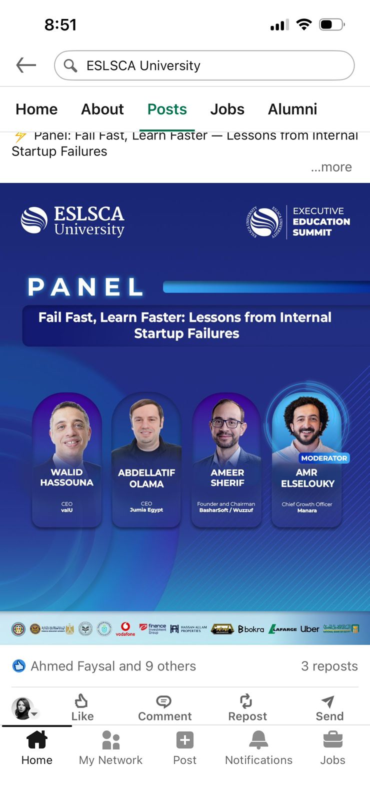تحت عنوان افشل سريعًا… وتعلّم أسرع شارك عبد اللطيف عُلما، الرئيس التنفيذي لشركة جوميا مصر، في جلسة نظمتها جامعة ESLSCA ضمن فعاليات قمة التعليم (Education Summit) التي عقدت على مدار يومي 22 و 23 نوفمبر الجاري حيث سلط الضوء على أهمية بناء بيئة تجارب مسؤولة وآمنة في عالم التجارة الإلكترونية، تمكّن الابتكار دون الإضرار بالمستهلك أو بالمنظومة الاقتصادية. وأكد أن تجربة المستخدم لم تعد خيارًا ثانويًا أو رفاهية، بل أصبحت عنصرًا جوهريًا في نجاح أي منصة رقمية.