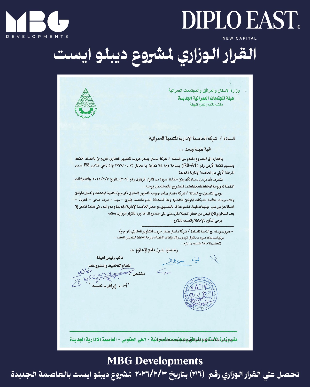 أعلنت شركة «MBG» للتطوير العقاري حصولها على القرار الوزاري رقم 216 لسنة 2026 لمشروع «ديبلو إيست» Diplo East New Capital، أحد أبرز المشروعات السكنية بالعاصمة الإدارية الجديدة، في خطوة تعطي الشركة المزيد من المرونة والكفاءة في المخطط التفصيلي للمشروع، والمزيد من التميز والتنوع بالخدمات.