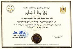 وأشار د. حيدر أن كلية التكنولوجيا الحيوية بجامعة مصر للعلوم والتكنولوجيا تلتزم بتخريج أخصائي تكنولوجيا حيوية طبقًا للمعايير الأكاديمية المعتمدة يلبي احتياجات سوق العمل المحلي والإقليمي في القطاعات الطبية والصيدلانية والزراعية والبيئية وإجراء بحوث علمية مبتكرة وتقديم خدمات مجتمعية واستشارات علمية في إطار قيم ارتقائية، ونهدف أن تكون الكلية معتمدة أكاديميًا ورائدة في مجالات التكنولوجيا الحيوية على المستوى المحلي والإقليمي والدولي.